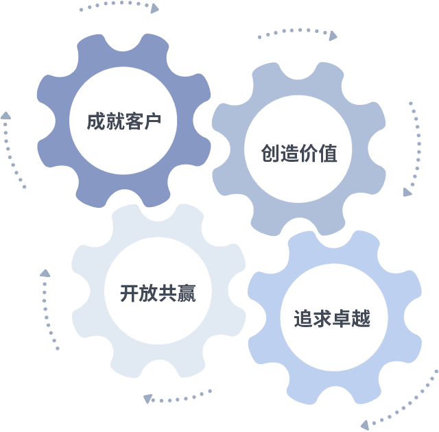 成就客户是一切决策的出发点,,创造价值是衡量所有工作的标准,,,追求卓越是我们做事做人的态度,,,,开放共赢是我们的格局也是最终的结果。。。。价值观的齿轮环环相扣,,,推动着组织里的每个人不断向前。。