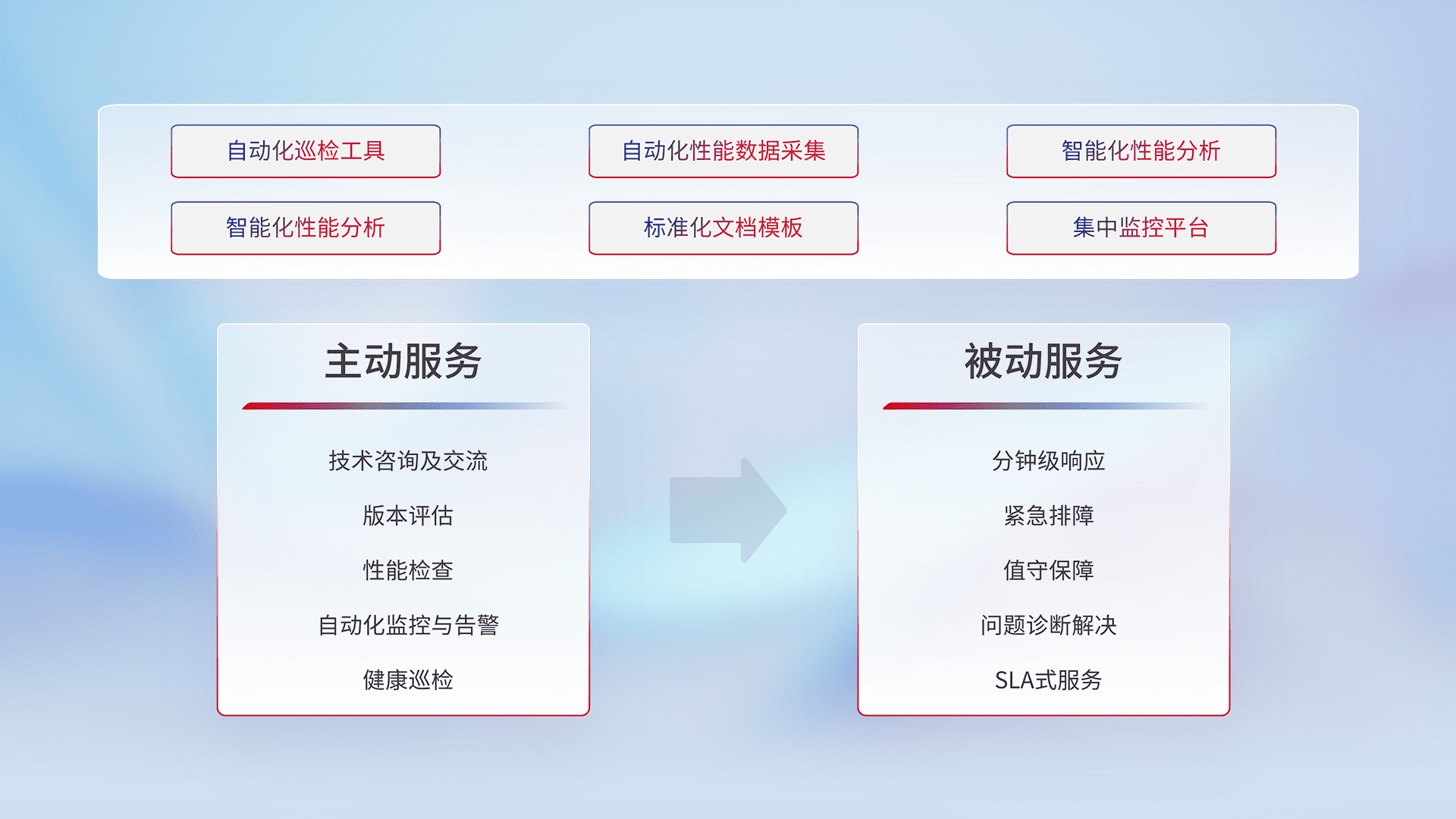 智能化工具和标准化文档,,,保障服务质量,,,,提供主动服务(包含技术咨询、、、、版本评估、、性能检查、、、自动化监控与告警、、、健康巡检)和被动服务包含(分钟级响应、、、紧急排障、、、值守保障、、、问题诊断解决、、、SLA服务)。。。